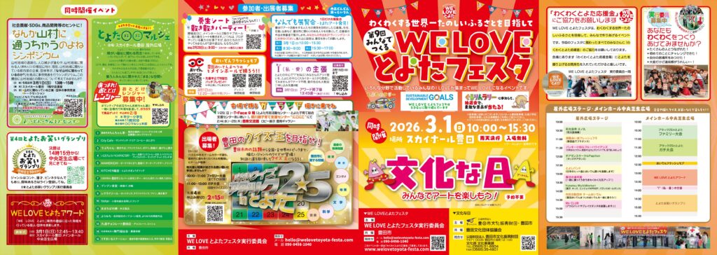 【イベント内容】とよたに関わる様々な分野で活動しているみんなのI LOVE が集まって「WE LOVE とよた」になるイベントです!人の輪を通じて集まった118の市民団体・企業や個人によるブース出展(店)。活動紹介展示、制作物の展示、ワークショップ、ステージ、物販など。
